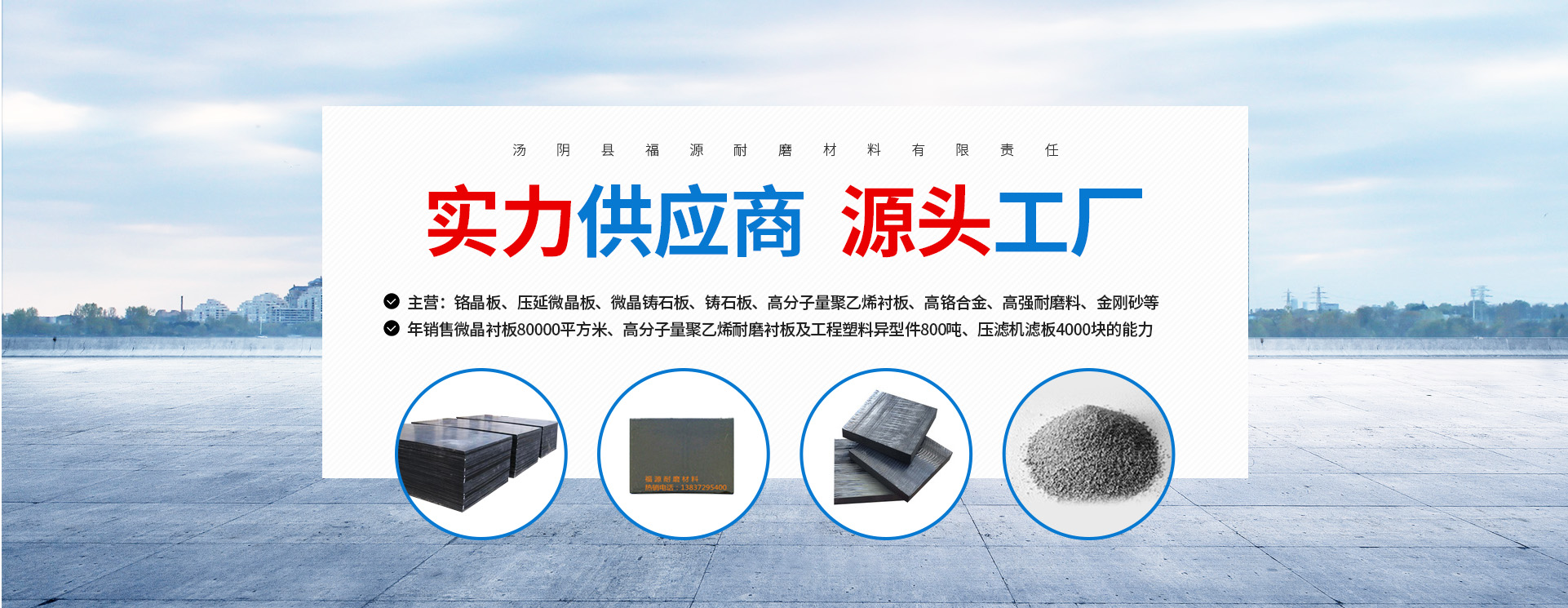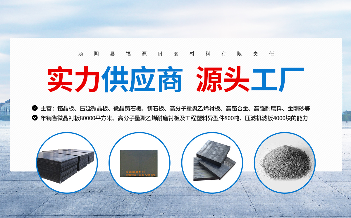 湯陰縣福源耐磨材料有限責任公司主要從事鉻晶板、壓延微晶板、微晶鑄石板、鑄石板、超高分子量聚乙烯襯板、高鉻合金、高強耐磨料、金剛砂、地坪、塑料制品、塑料原料的銷售、安裝、維修,公司位于民族英雄岳飛故里及易經發源地周文王八卦演易中心,距107國道1公里,京深高速公路1.5公里,南距河南省會鄭州170公里,西距煤城鶴壁18公里,東距油城---濮陽100公里,北距世界文化遺產殷商古都安陽市19公里。交通十分便利,公司廠址緊靠湯河水庫,水資源十分豐富。公司以科技進步為先導,迅速發展成為安陽技術企業。公司具有年銷售微晶襯板80000平方米、超高分子量聚乙烯(英文名UHMW-PE)耐磨襯板及工程塑料異型件8